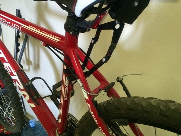 !Самый надежный вариант фиксации крюка за велосипед: за руль и за раму под сидушкой. Для надежности можно привязать велосипед к крюкам.