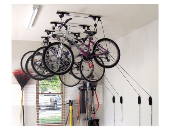 На потолке закрепляются 2 платформы (на расстоянии 800— 900 мм друг от друга в зависимости от велосипеда). На каждой платформе предусмотрено 10 отверстий под крепеж.