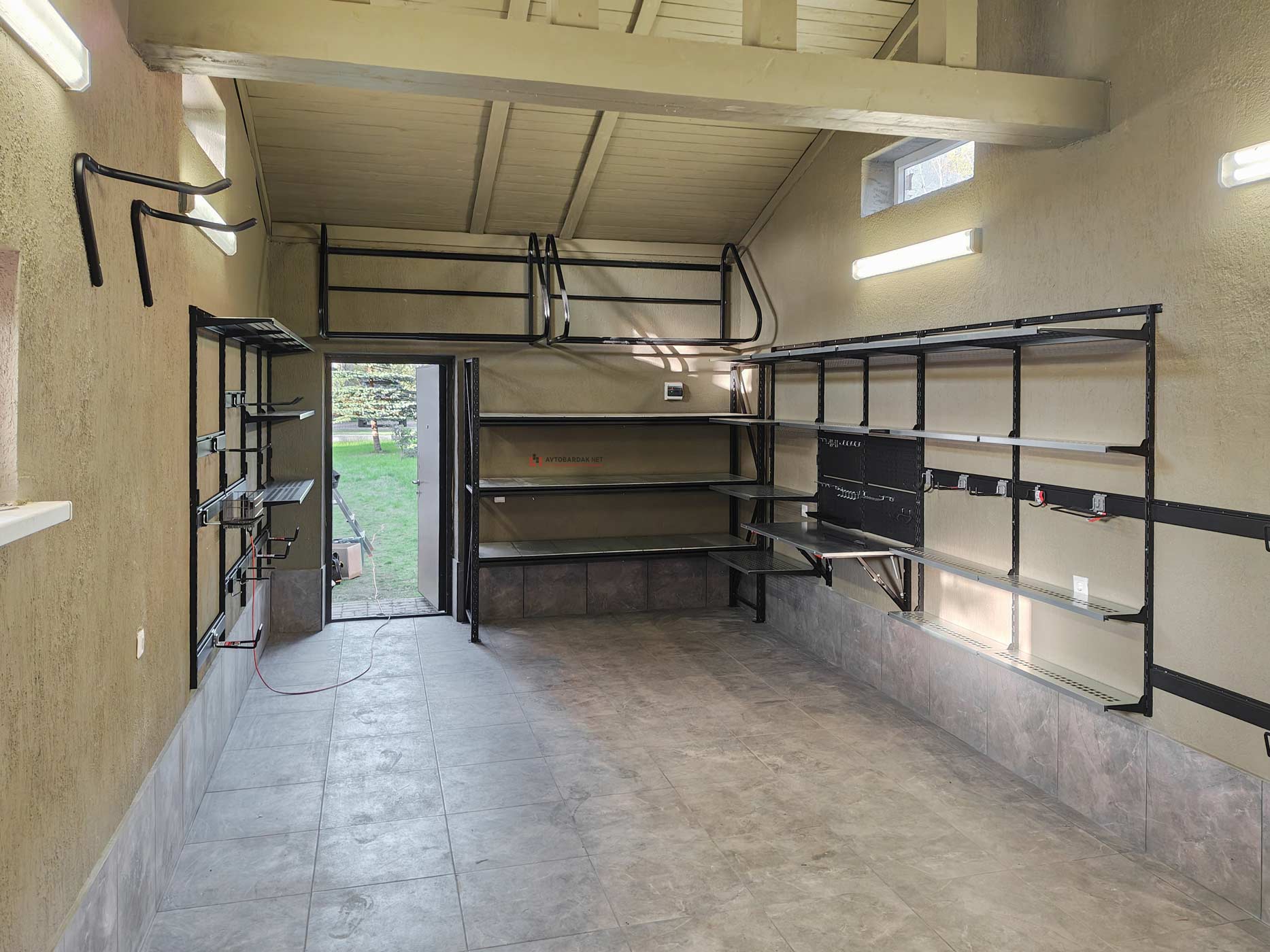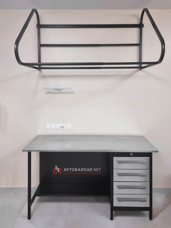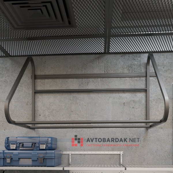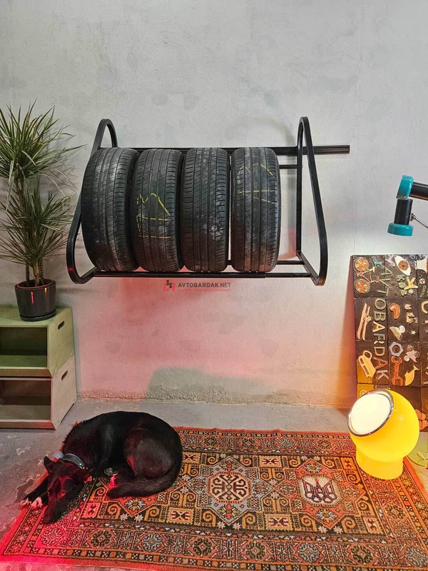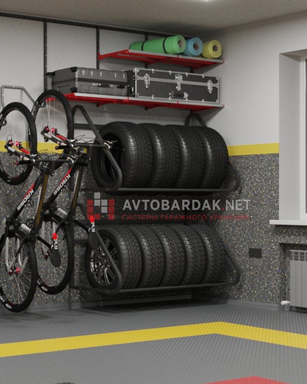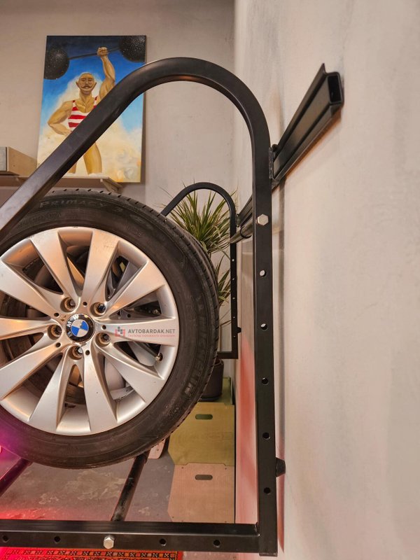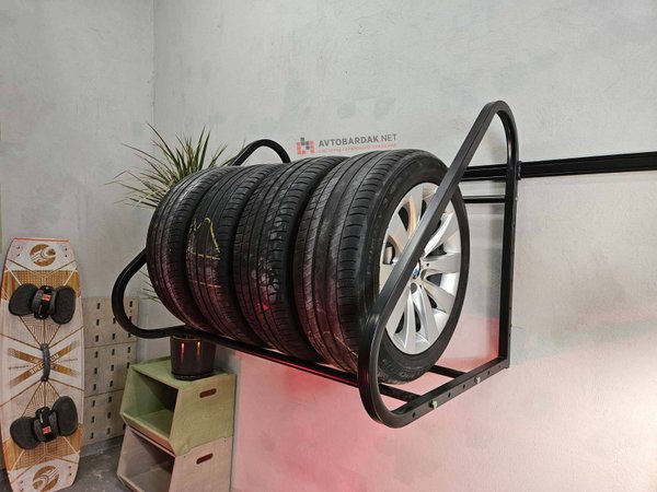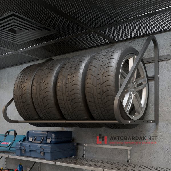 Регулируемая раздвижная полка для хранения на стене комплекта колес с дисками (до R22 включительно, с шириной колес до 330 мм). Общая нагрузка на полку 300 кг. Подходит для стен из пеноблоков.
