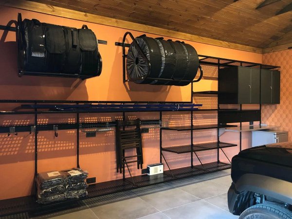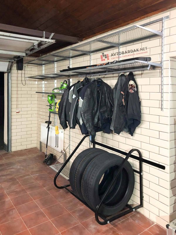 Чем дальше от стены трубы, на которых стоят колеса, тем больший радиус колеса поместится на полку (максимальный допустимый диаметр колеса от края до края 1000 мм). На полке можно хранить комплект колес шириной до 330 мм.