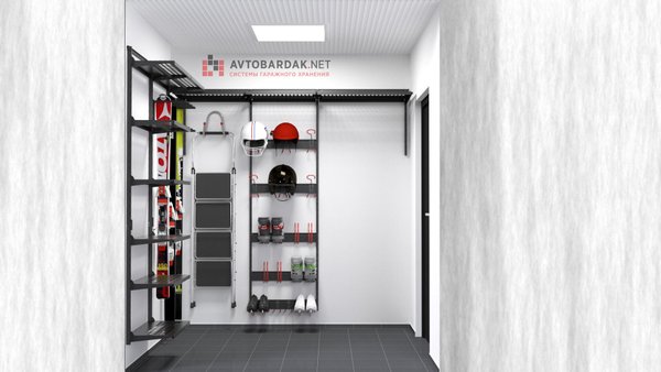 Кладовка со стальными полками черного цвета. На стенах закреплены прорезиненные блоки для хранения лыж. Установлены ряды металлических модульных полок. На одной из стены закреплены ряды рейлингов с крюками для подвеса шлемов, лыжных ботинок или коньков. Самокаты можно закрепить под полками на крюки.