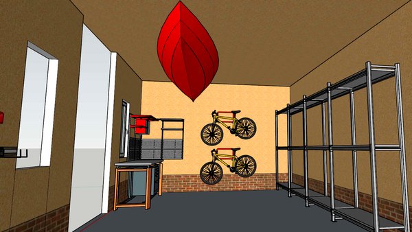 Напольные стеллажи длиной 4 м по правой стене. Кронштейны для велосипедов на торцевой и слева в углу рабочая зона: верстак 1800 мм, тумба с 4 выдвижными ящиками, перфопанели, ящики и полки для хранения инструментов.