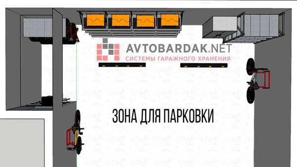 Обустройство зоны, расположенной за двумя парковочными местами в большом гараже. Зона парковки выделена двумя резиновыми колесоотбойниками на полу. По краям смонтированы кронштейны для подвеса велосипедов. Зона хранения садовых инструментов, подкатной стеллаж для хранения 2 комплектов колес, настенный стеллаж, усиленный ребрами жесткости и дополнительными зацепами для кронштейнов. Правее закрытый металлический шкаф для одежды и напольный стеллаж.