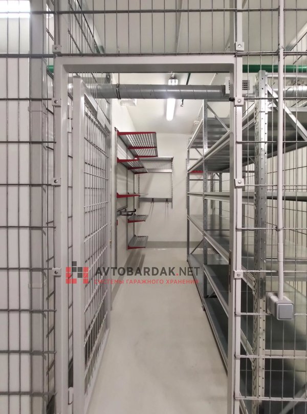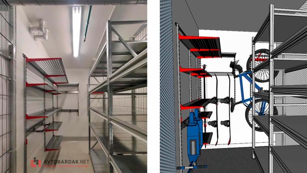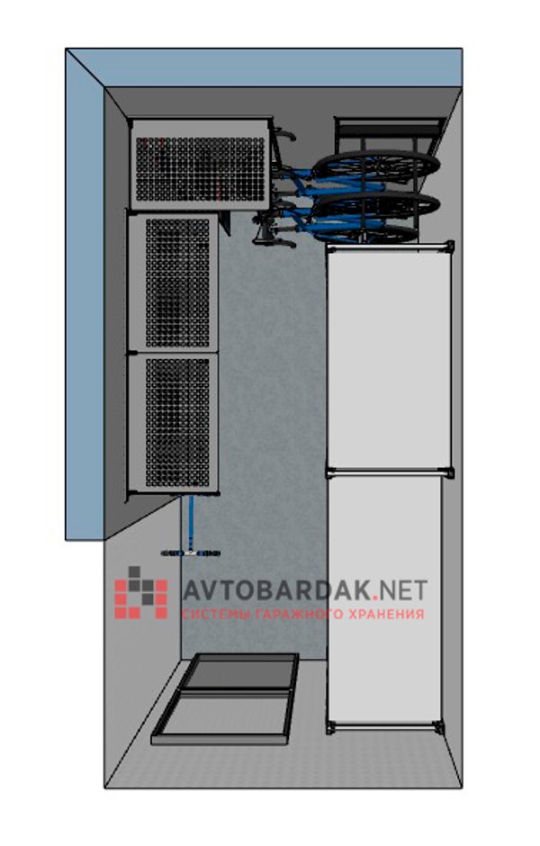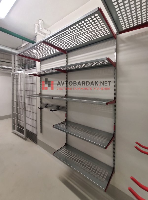 На других стенах металлические настенные полки, крепления для самокатов, сноубордов и велосипедов.