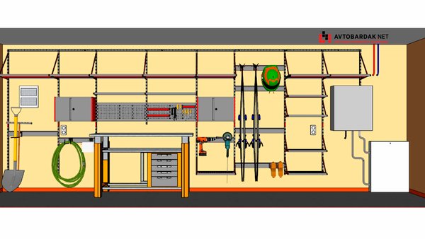 Обустройство одной стены в гараже. Длина стены 6,45 м. В верхней части усиленные полки глубиной 520 мм. Слева зона для хранения садовых инструментов. В центральной части рабочая зона с усиленным верстаком длиной 1500 мм с тумбой с 5 выдвижными ящиками. Над верстаком полки, закрытые ящики для инструментов, перфорированные панели с лотками и крючками, рейлинги для подвеса электроинструментов. Правее располагается секция стеллажа для хранения лыж и аксессуаров. В правой части вертикальный ряд усиленных полок глубиной 315 мм.