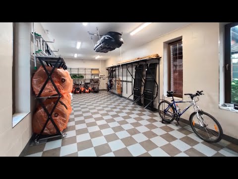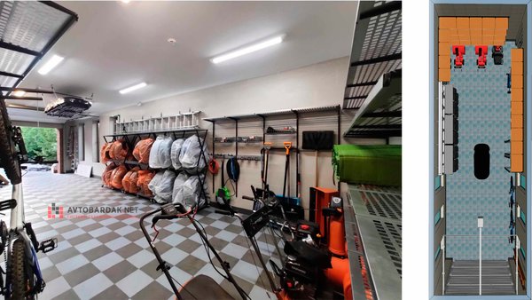 Разместили 5 комплектов колес на подкатных стойках, крепление для багажного бокса смонтировали на крышу. Три стены максимально задействованы системами хранения: металлические полки, крепления велосипедов, лыж, шезлонгов, длинномеров, лопат и других садовых инструментов.