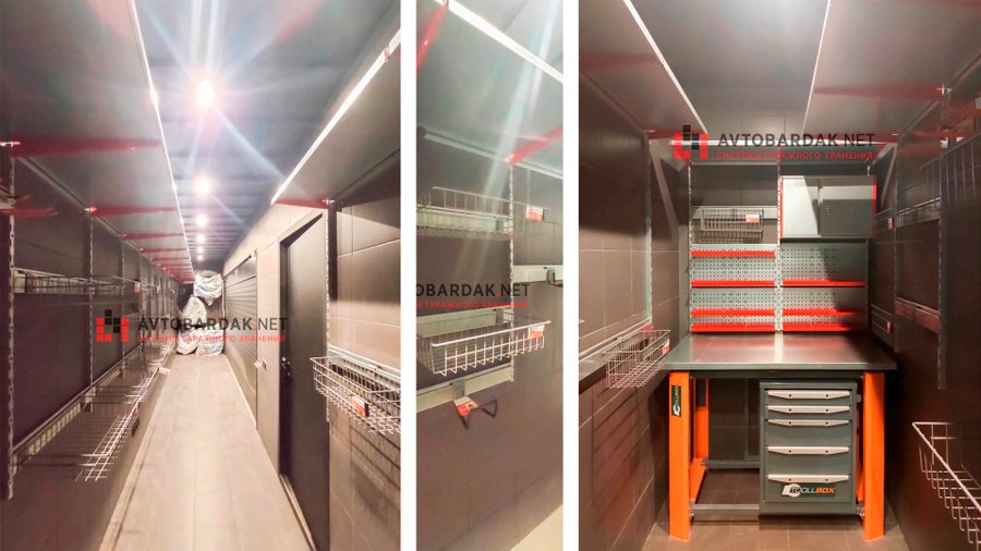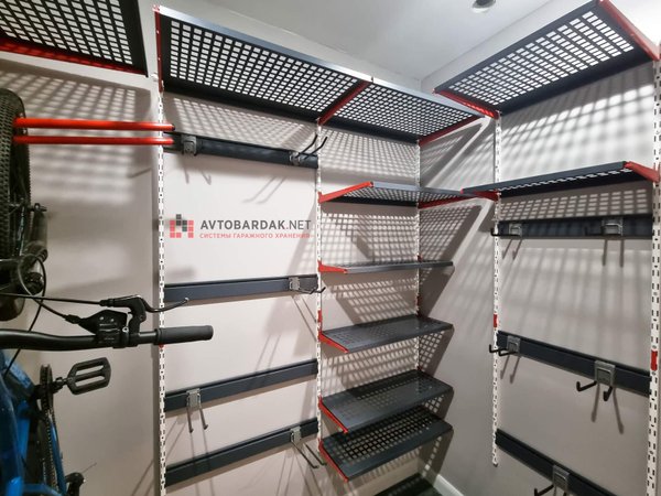 На левой стене кладовки располагается зона для хранения инструментов на перфопанелях. На стене напротив входа - крепления для подвеса двух велосипедов (вертикально вдоль стены). На стене справа - крюки для другого спортинвентаря и стеллаж из металлических полок глубиной 315 мм. По всем стенам в верхней части кладовки более глубокие полки (520 мм).