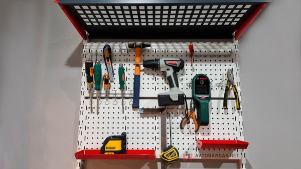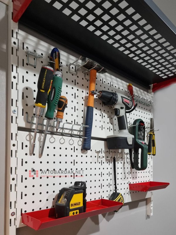 Набор крючков и лотков для хранения инструментов на перфопанелях.