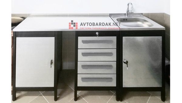 Металлический двухтумбовый верстак и тумба с раковиной. Глубина верстака и тумбы 50 см. Обращаем ваше внимание - тумбы заподлицо со столешницей и раковинами. Если на полу плинтус, необходимо использовать кухонный верхний плинтус, чтобы скрыть зазор между столешницей, раковиной и стеной. Тумбы комплектуются регулируемыми ножками.