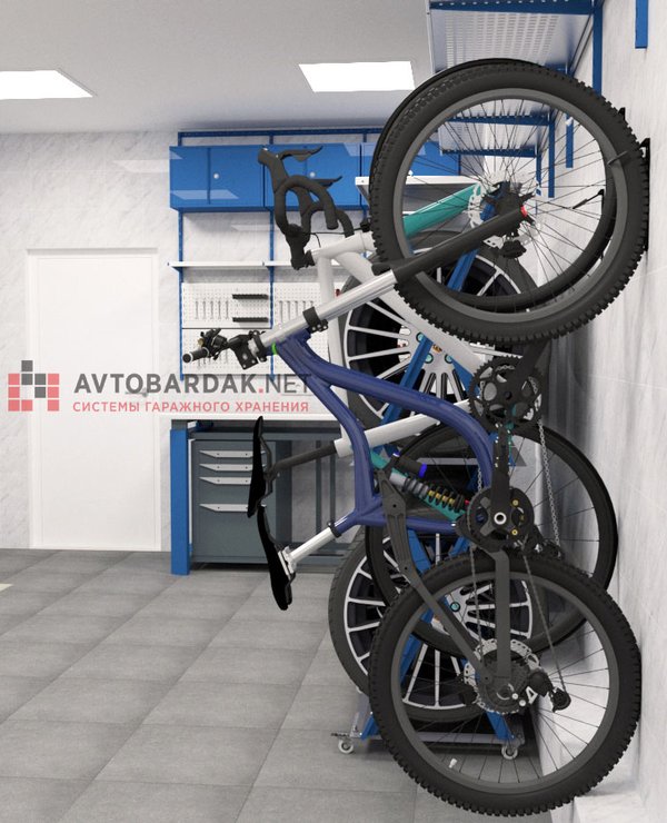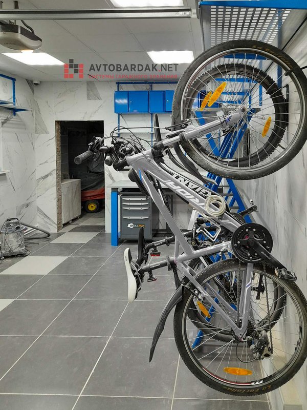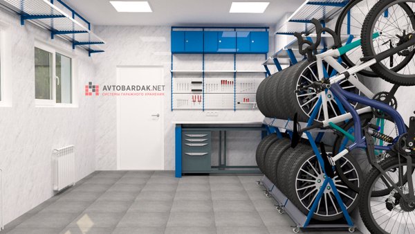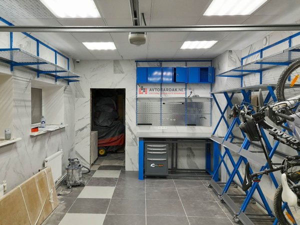Гараж 6,6 м на 3,6 м. В рабочей зоне установлен верстак, над ним — перфопанели и навесные ящики. Для хранения шин предусмотрены вертикальные стойки. Велосипеды подвешены на крюках на стене. По периметру помещения расположены ряды металлических модульных полок. Более подробную информация про модульную систему металлических полок вы найдете по ссылке.