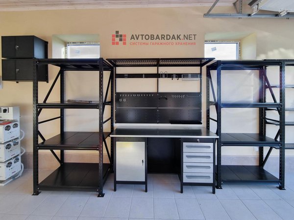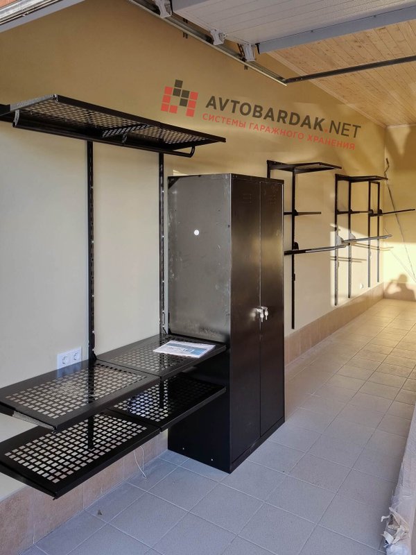 Гараж 7850 на 5000 мм (S 39 кв м). Брутальный проект с черными элементами мебели гармонично смотрится на фоне бежевых стен. В обустройстве гаража используются напольные стеллажи, металлический рамный верстак, перфопанели, навесные ящики. Также установлен металлический шкаф и перфорированные модульные полки вдоль стен. Для хранения шин предусмотрены настенные крепления.