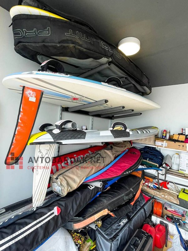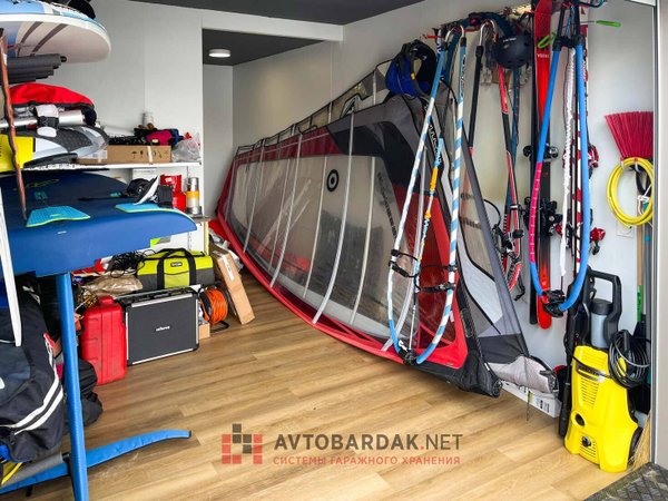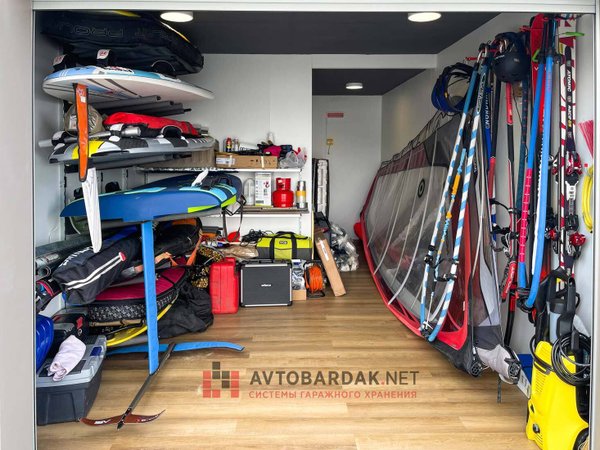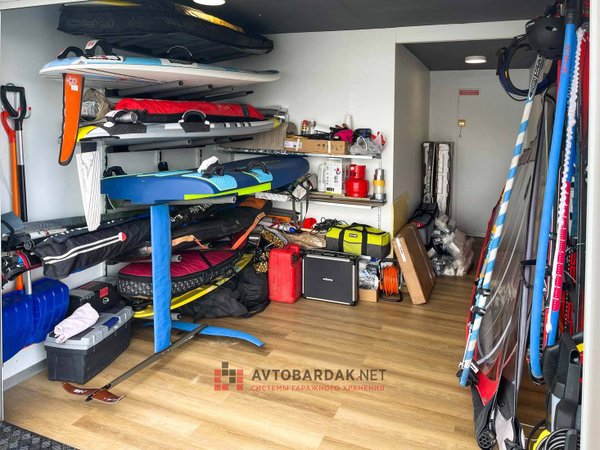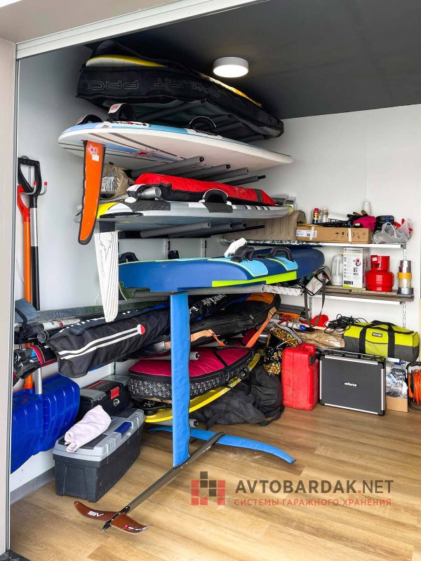 Комната для хранения спортивного инвентаря: лодок, досок для серфинга и парусов. Размер помещения: 3309 мм на 3453 мм. На стенах установлены металлические полки, универсальные модули IF и рейлинги с крюками для подвеса лыж.