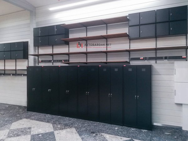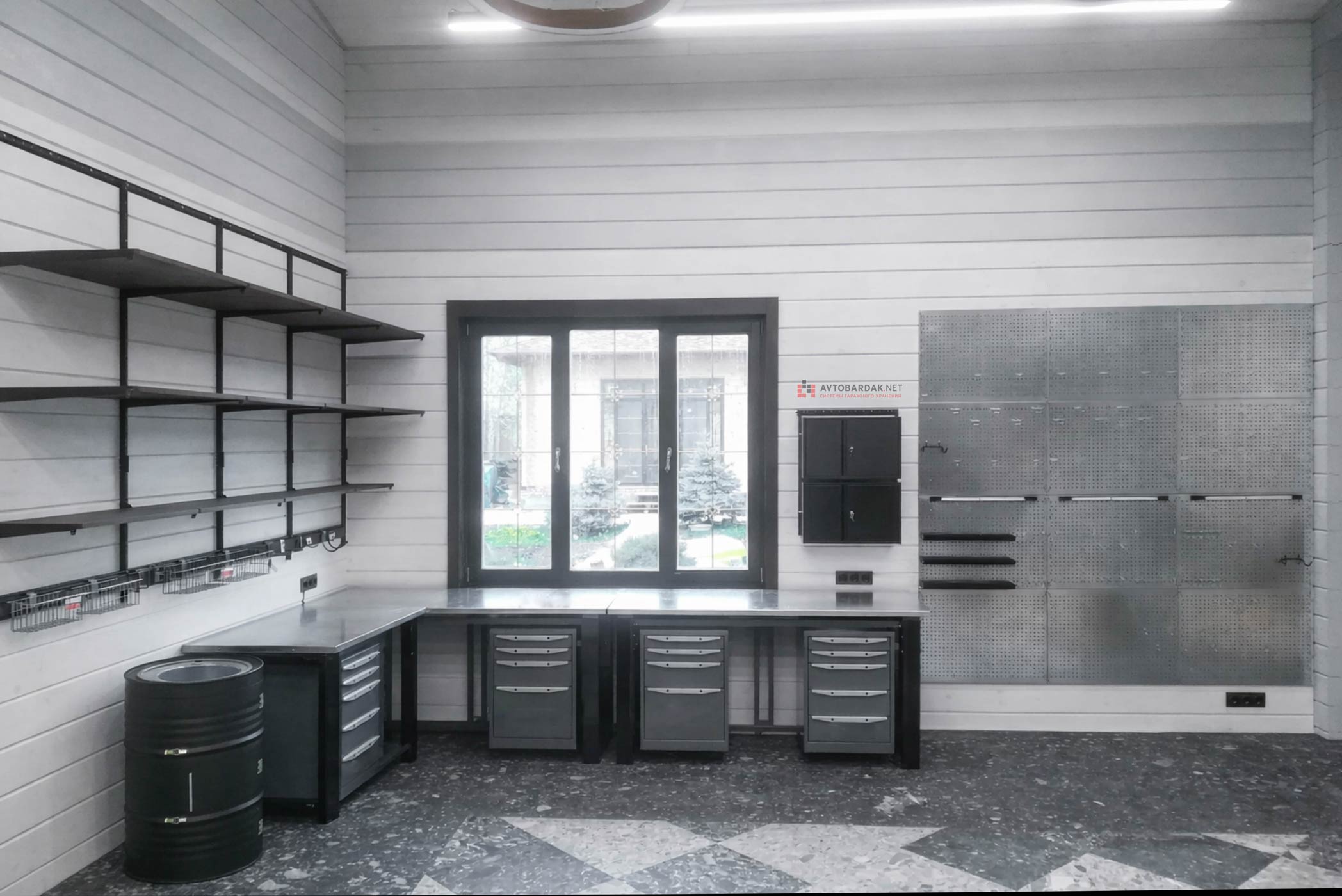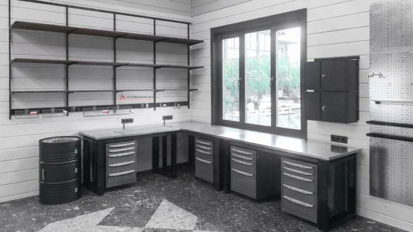 Установили три усиленных верстака с тумбами, черные металлические шкафы, черные навесные ящики. Одну из стен закрыли перфопанелями от пола до потолка. Также разместили деревянные полки и рейлинги с крюками для подвеса инвентаря. В углу поставили бочку с раковиной в стиле лофт.