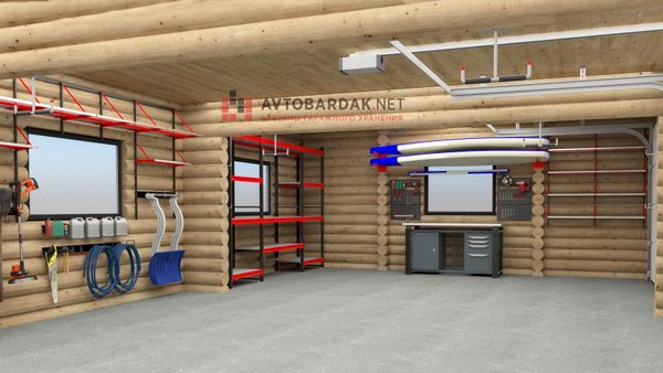 Установили усиленный металлический верстак с двумя тумбами. Над ним закрепили черные перфопанели и рейлинги. На нескольких стенах в гараже повесили металлические модульные полки. Также на потолок подвесили крепления для лодок и другого крупного инвентаря. А еще спроектировали напольный стеллаж вокруг окна.