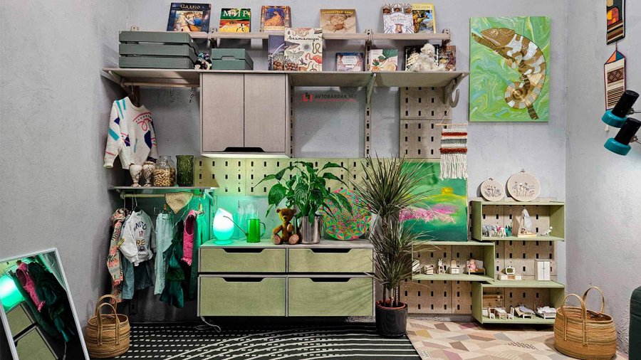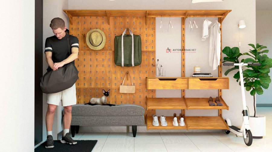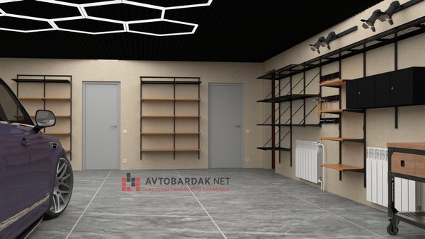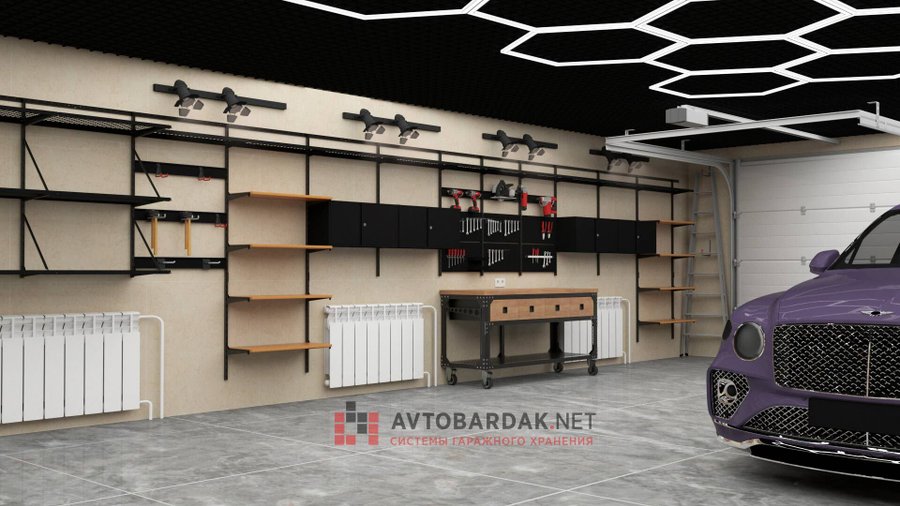 Проект невероятно стильного гаража. В зоне мастерской установили верстак лофт, черные перфопанели, деревянные и металлические модульные полки, также закрепили рейлинги. На противоположной стене спроектировали зону хранения спортинвентаря. Установили модули IF для подвеса велосипедов, крюки на рейлинги для хранения шлемов, ракеток и другого снаряжения. Также закрепили на рейлинге корзину для хранения мячей.