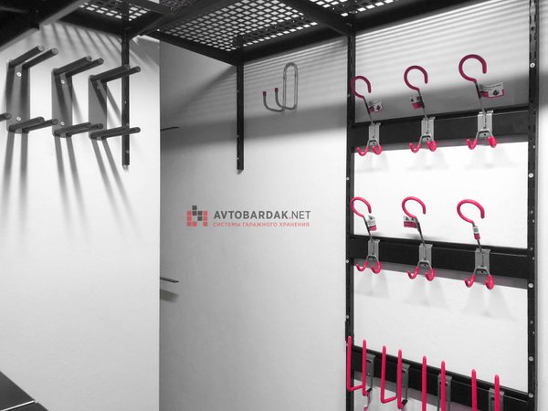 Кладовка для хранения спортивного инвентаря и других вещей. На стенах закреплены прорезиненные блоки для хранения лыж. Установлены ряды металлических модульных полок. На одной из стены закреплены ряды рейлингов с крюками для подвеса шлемов, лыжных ботинок или коньков. Самокаты можно закрепить под полками на крюки.