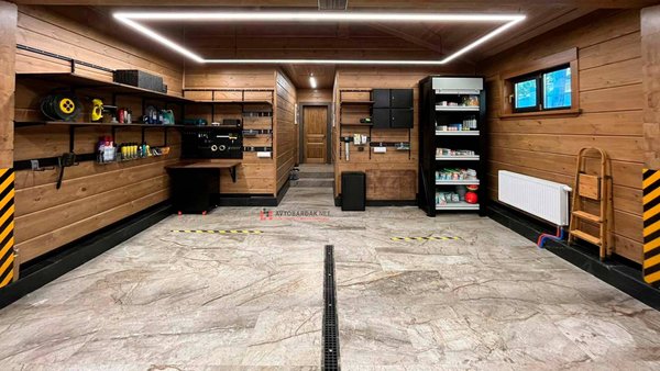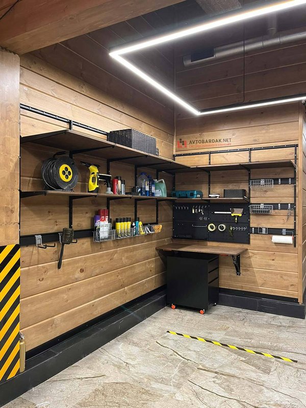 В проекте использованы деревянные полки на металлической раме. В рабочей зоне установили складные столы и подвесили черные перфопанели на стену. Для хранения более крупных инструментов и инвентаря закрепили рейлинги и повесили шкафчики. Под стол установили тумбу с ящиками. В углу установили напольный стеллаж с рольставней.