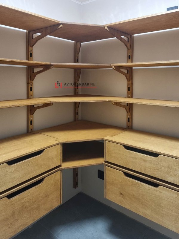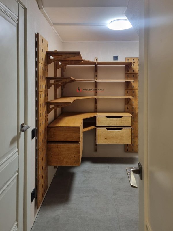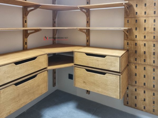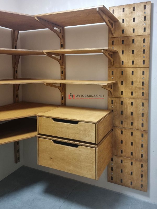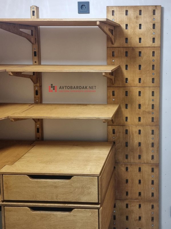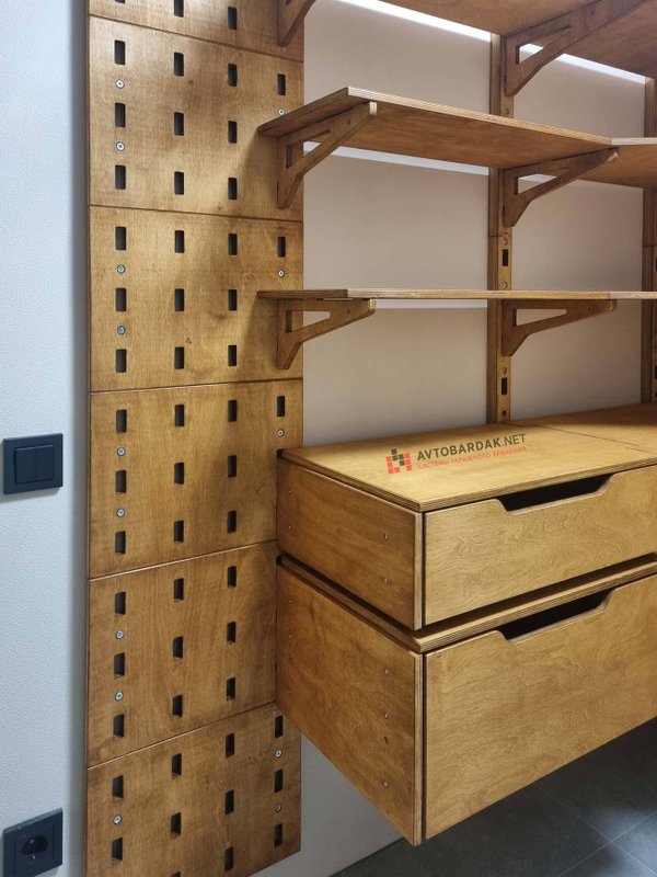 Деревянная кладовая состоит из взаимозаменяемых модульных элементов: ящики, полки, пегборды и крюки можно перевешивать в любое время под возникающие задачи.