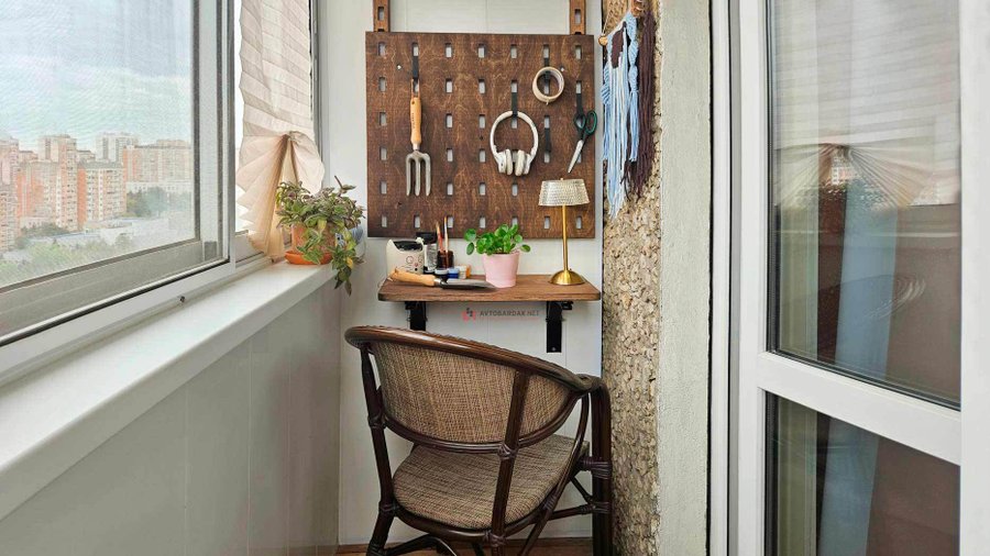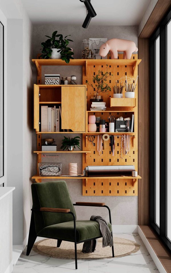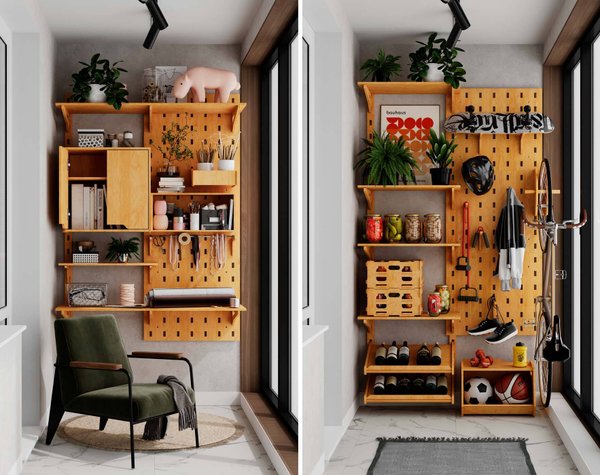 Уютное обустройство балкона: с системой Woody мы установили деревянные полки, шкаф, полки под наклоном с бортиком. Также поставили ящик-сидение и ящики под банки с вареньем.
