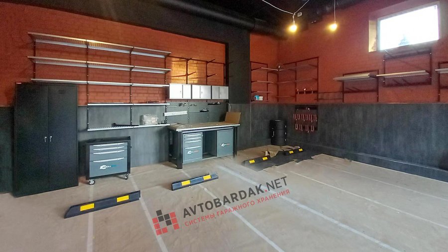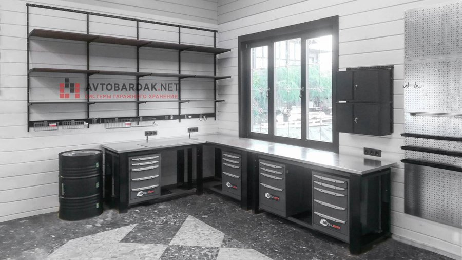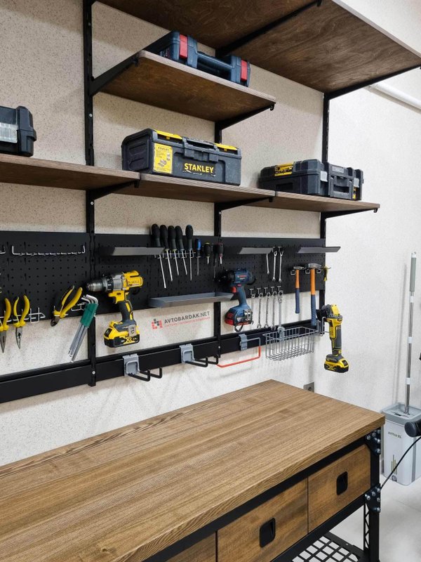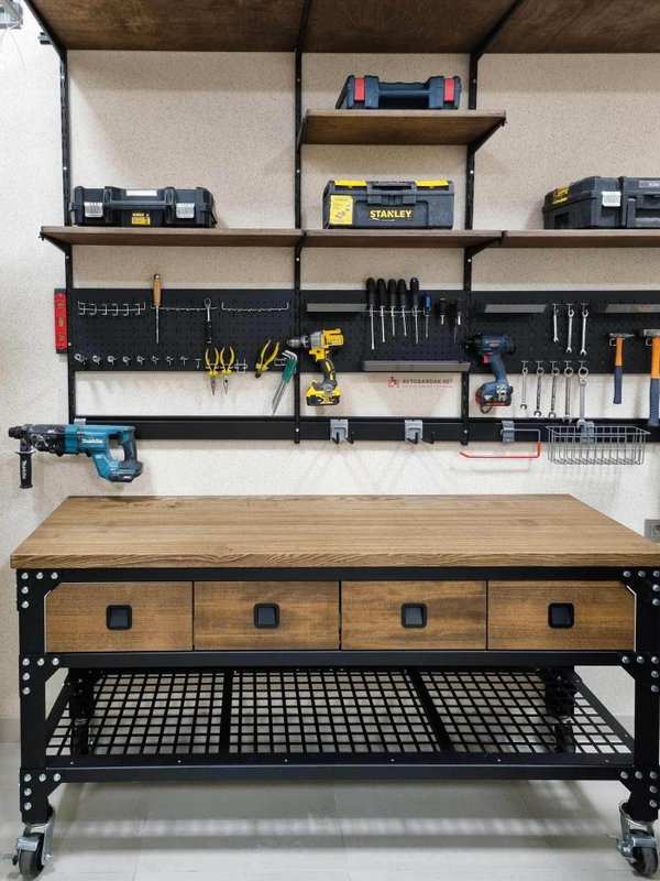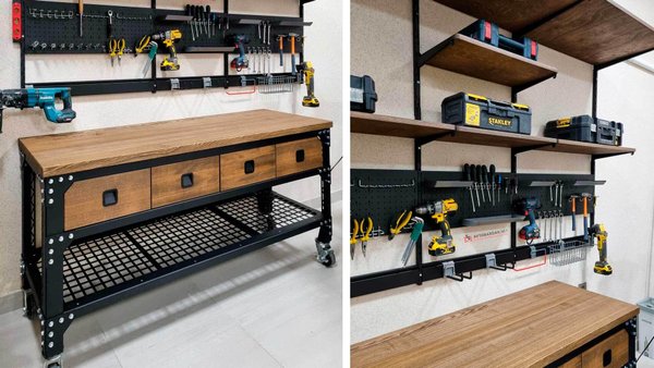 Обустройство рабочей зоны в стиле Loft. Роскошный верстак из бука и стали, черные перфопанели и деревянные полки в цвете Орех. Все что нужно для рабочего места в гараже или мастерской.