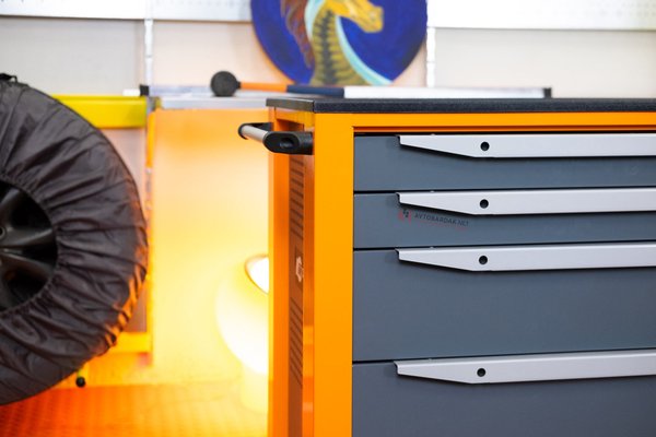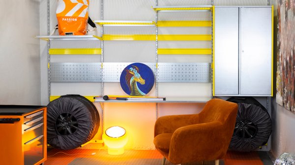 Обустройство гаража: функциональное и яркое. Установили на стену металлическую систему хранения: навесной шкаф, полки, перфопанели, рейлинги и откидной стол. Для хранения шин предусмотрены модули. Также поставили инструментальную тележку на колесиках. На полу панели из ПВХ, их легко менять в случае необходимости.