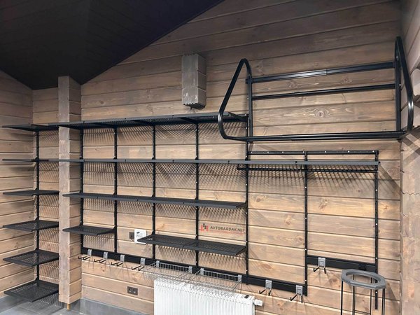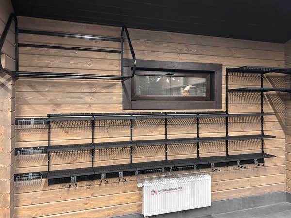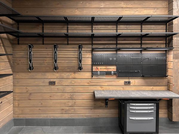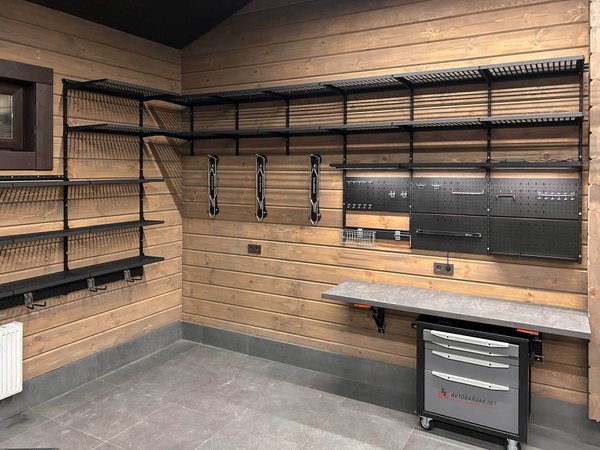 Обустройство мастерской в гараже из клееного бруса. Металлический напольный верстак и откидной стол с деревянной столешницей толщиной 40 мм. Над верстаками расположена рабочая зона с черными перфорированными панелями, полками и крюками для хранения инструментов. Гараж так же обустроен сборными настенными стеллажами черного цвета, усиленной полкой для хранения больших колес, поворотными креплениями для подвеса велосипедов, корзиной для хранения мячей.
