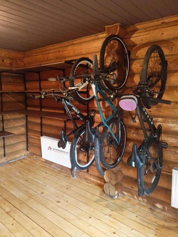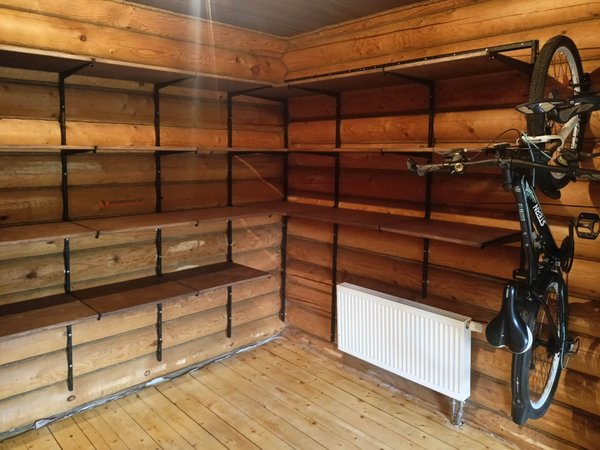 Деревянный гараж из цилиндрического бруса. Мы установили систему деревянных полок на металлической раме по периметру гаража. Поставили верстак Loft Garage из бука. Для велосипедов закрепили на стене три крепления.