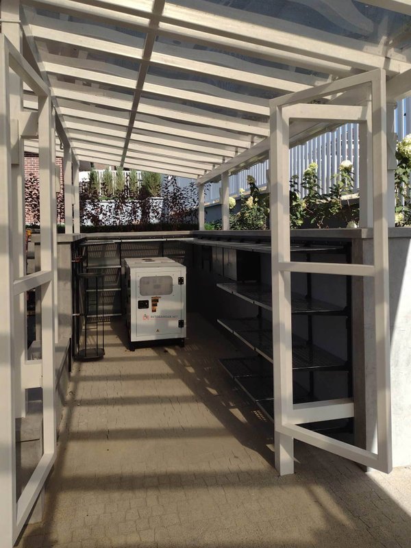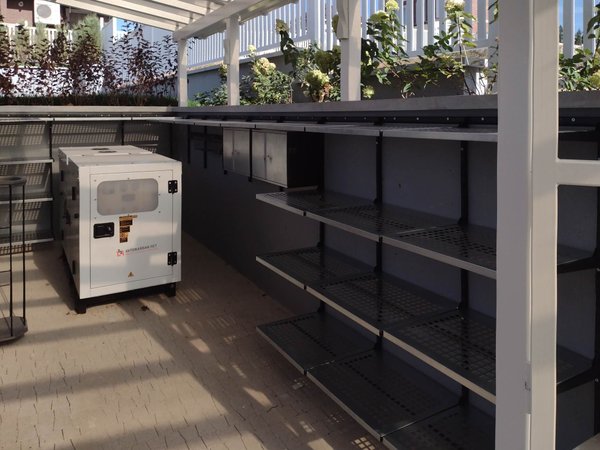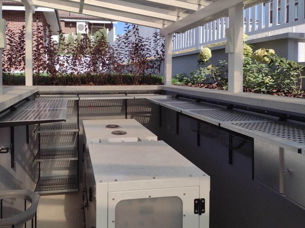 Металлические перфорированные полки в несколько рядов по периметру террасы, корзина для мячей, крюки для инвентаря закреплены на рейлингах. Также установлено два навесных ящика.