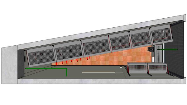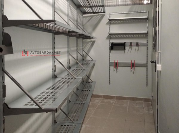 По длинной стене настенный стеллаж: 6 рядов полок. 3 верхних ряда глубиной 520 мм, нижний ряд глубиной 200 мм, посредине 2 ряда глубиной 315 мм. На стеллаже размещены 4 модуля для хранения двух комплектов колес.