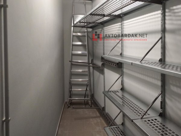 На стене 1,5 м настенный стеллаж из двух полок глубиной 200 мм и двух рейлингов с крюками и полотенцедержателем. На узкой стене расположена стремянка.