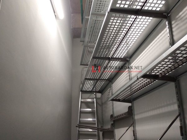 4 верхних ряда на длинном стеллаже и полки над дверью с системой усиления (ребра жесткости на полках и усилители кронштейнов).