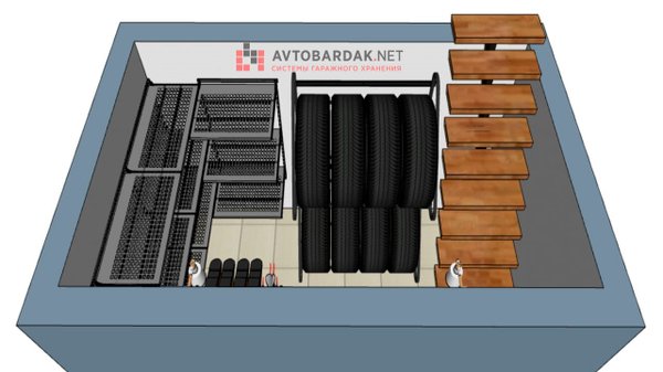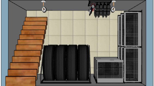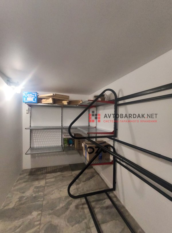 Кладовка 3,8 х 1,8 м расположена на цокольном этаже. Две настенные раздвижные полки для хранения больших и тяжелых колес и металлические полки. В проекте предусматривалась зона для лыж и аксессуаров, но в финальной версии решили отказаться от нее.
