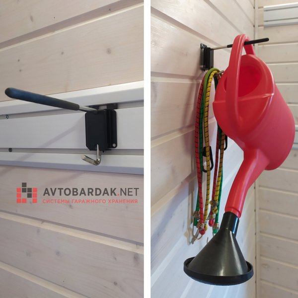 Или подвесить на рейлинги, как на фото в слайдере. Крепление к рейлингу такое же надежное, как при монтаже саморезами к стене, но в этом случае крюк можно снимать и перемещать по рейлингу под потребности.