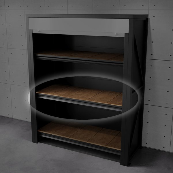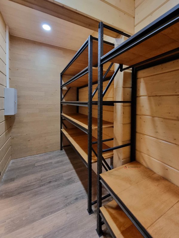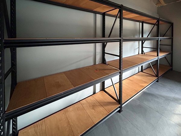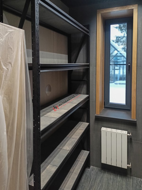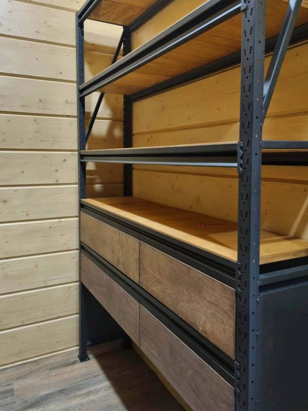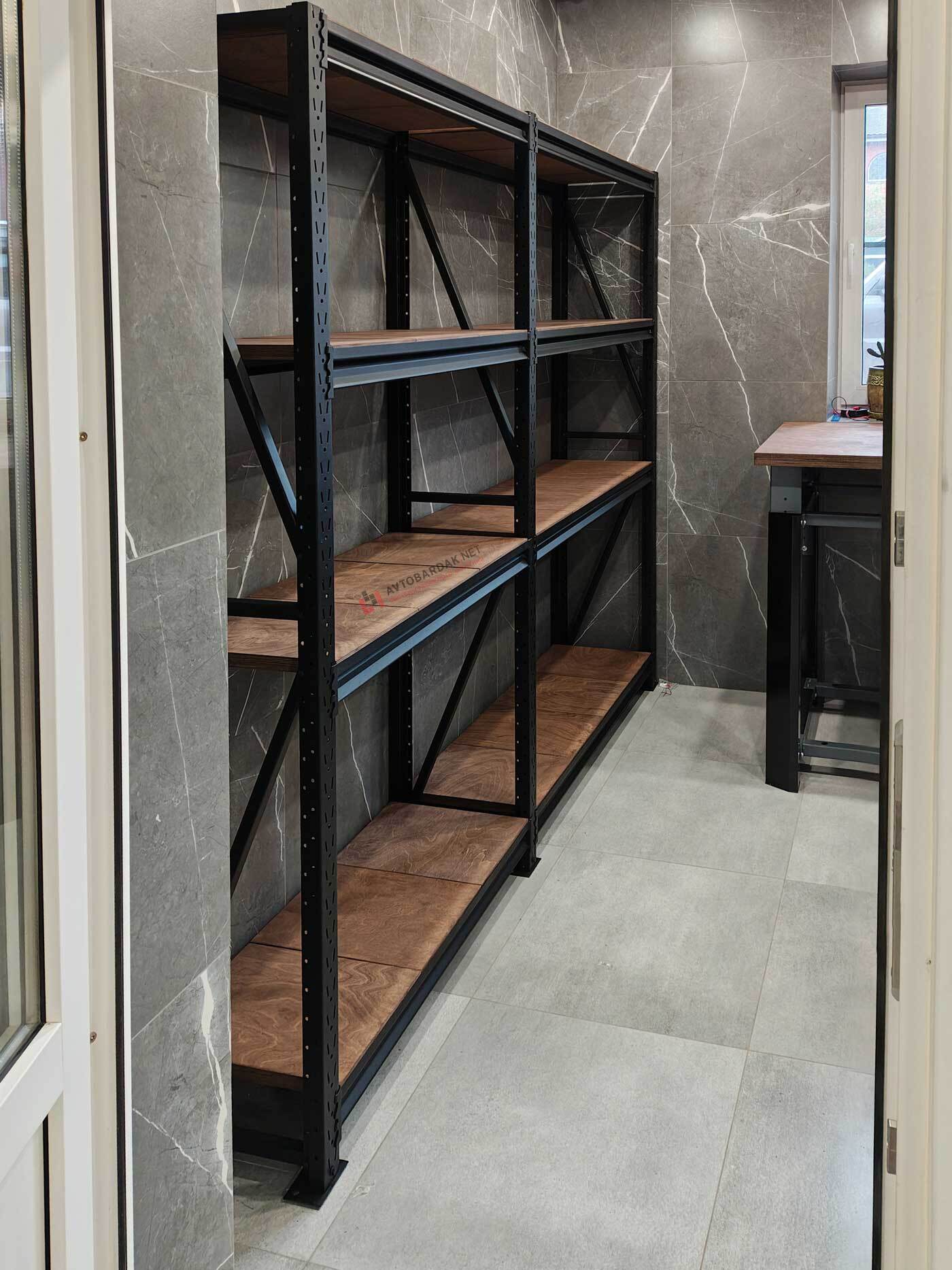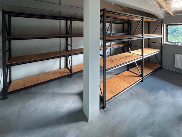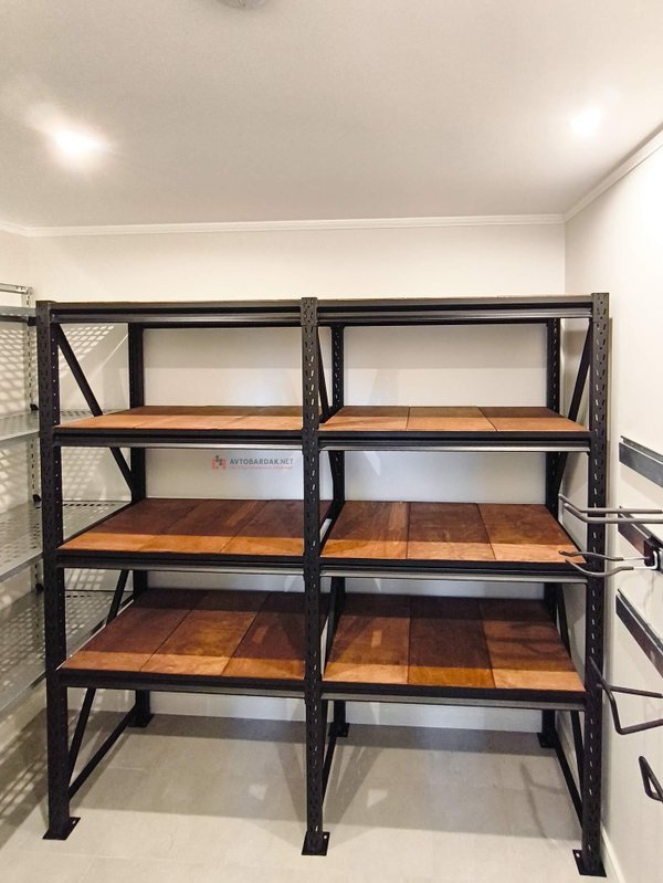 Ряд с деревянными полками для напольного стеллажа и для закрытого стеллажа с рольставней, которые изготавливаются на основе модульных напольных стеллажей.