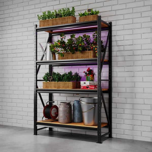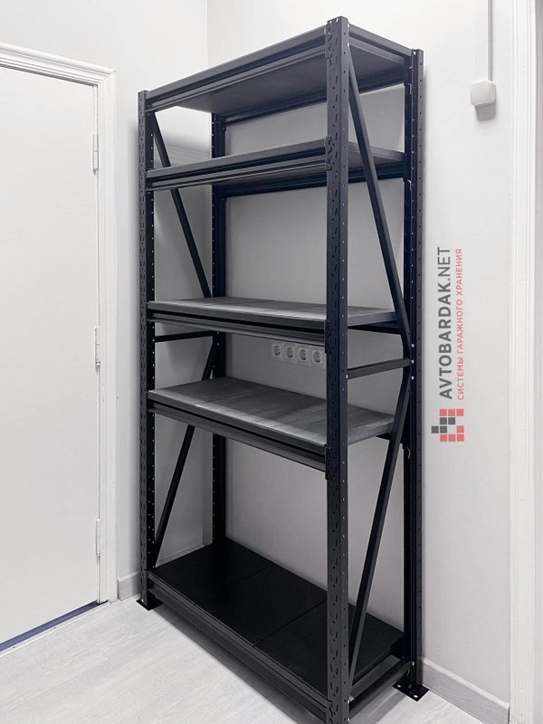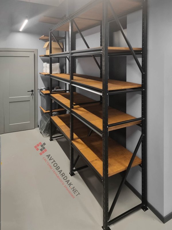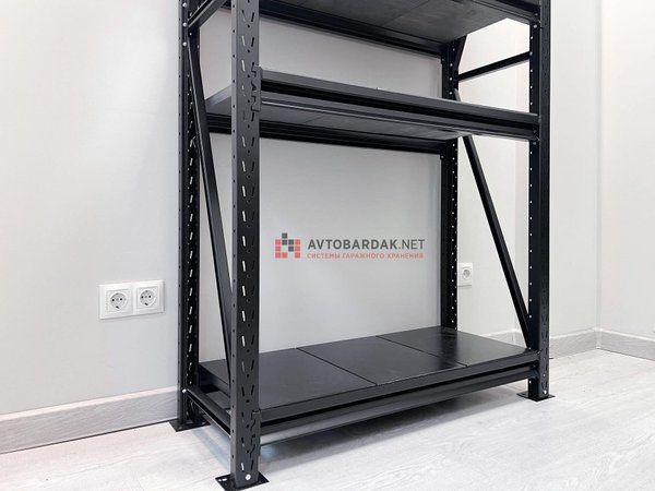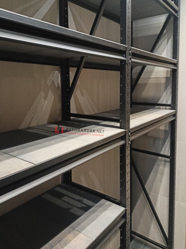 Ряды полок съемные. Т.к. горизонтальные балки на зацепах вставляются в перфорацию вертикальных стоек, их можно переставлять выше или ниже под потребности и хранимый инвентарь.