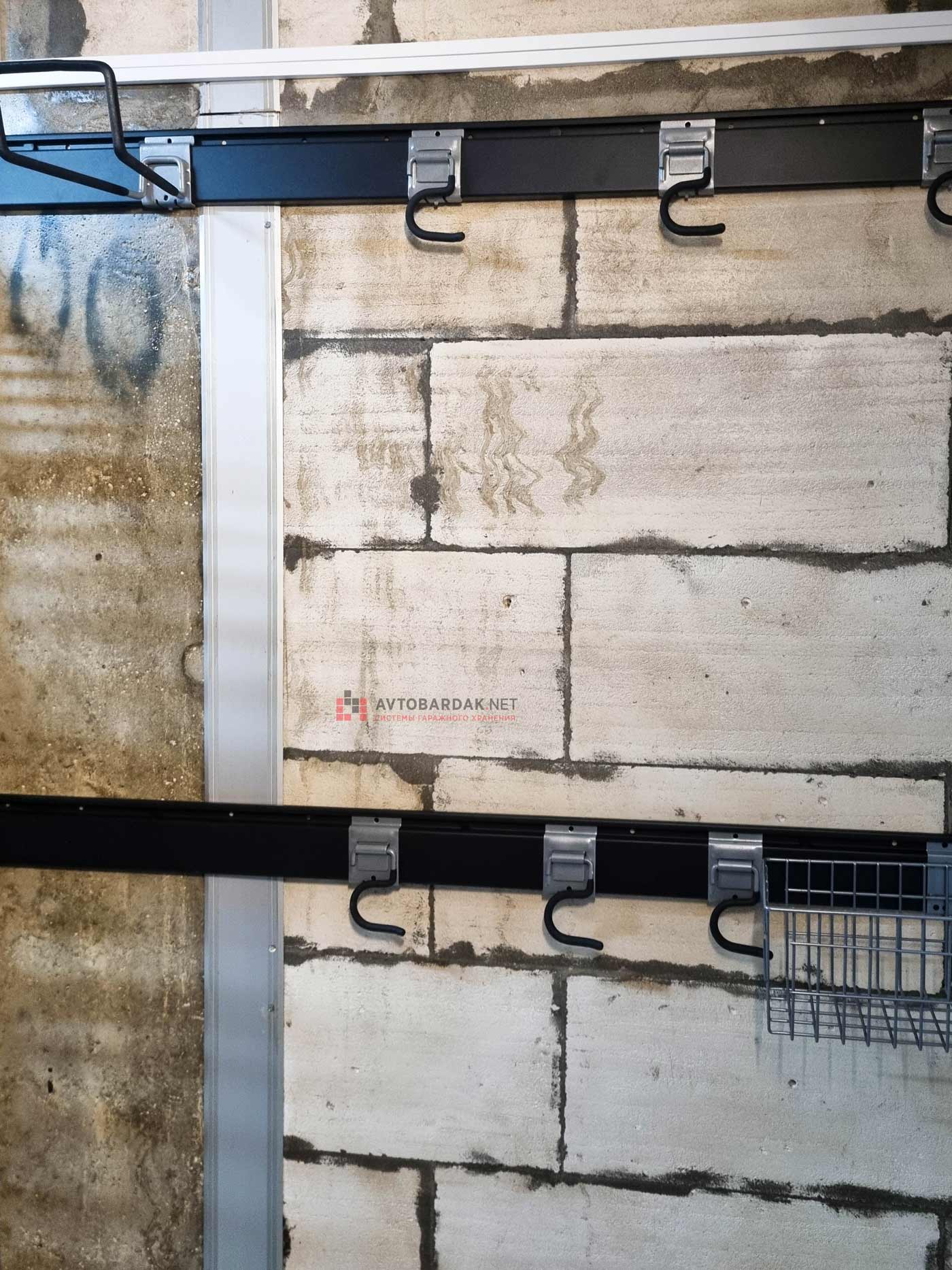 Экономичная система хранения садового инвентаря Esse Storage. Крепление к стене или к направляющему рельсу.