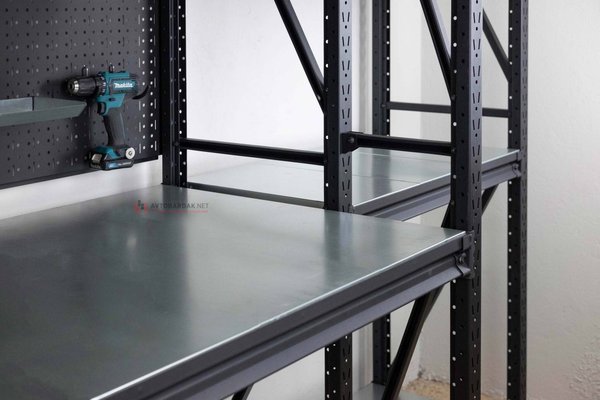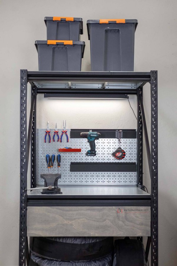 Для хранения инструментов - задние стенки - перфорированные панели для лотков, крючков (для ручного инструмента) и рейлингов (для больших крюков для тяжелых инструментов).