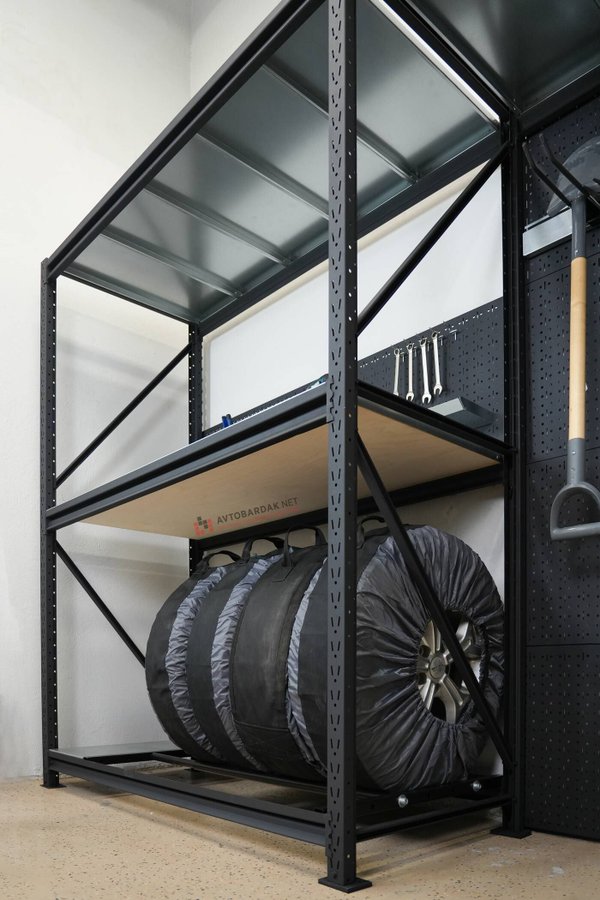 Специальные полки для колес (устанавливаются на балки) Полки для колес - раздвижные по длине от 900 до 1500 мм. Колеса устанавливаются на телескопические трубы, которые можно переставлять ближе\дальше друг от друга и от стены - так регулируется хранение колес разного диаметра.