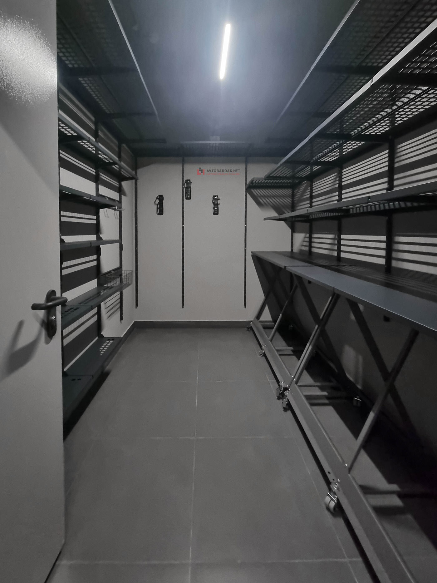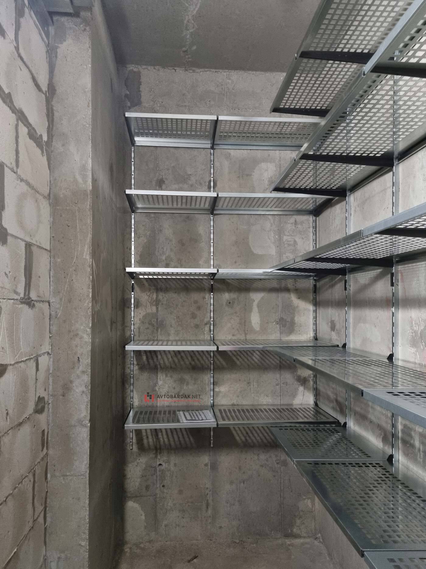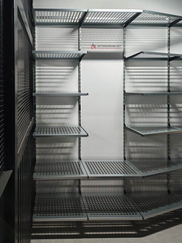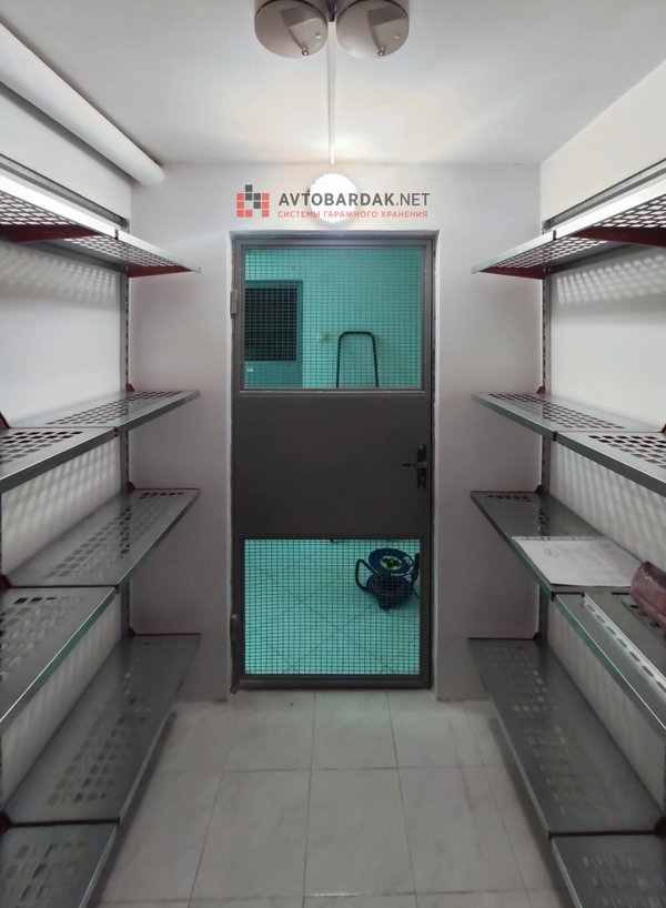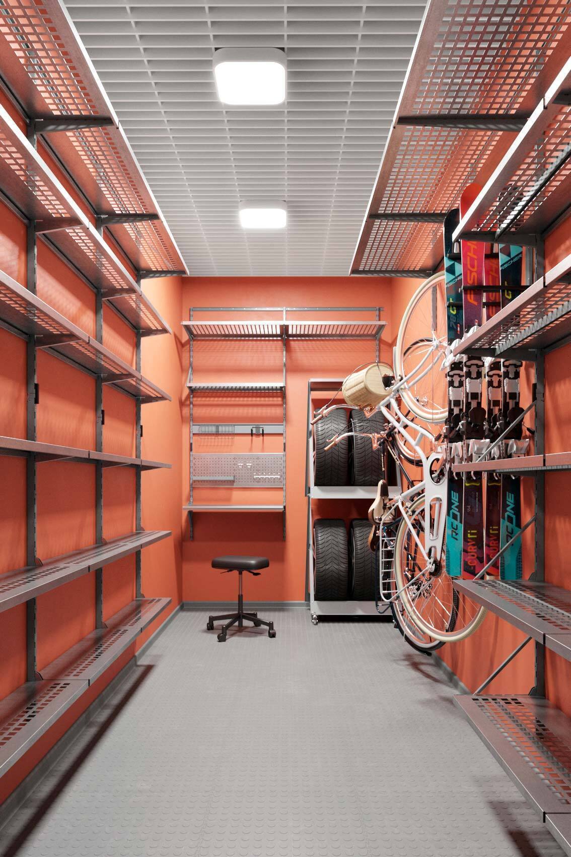 Кладовка со стальными полками черного цвета. На стенах закреплены прорезиненные блоки для хранения лыж. Установлены ряды металлических модульных полок. На одной из стены закреплены ряды рейлингов с крюками для подвеса шлемов, лыжных ботинок или коньков. Самокаты можно закрепить под полками на крюки.