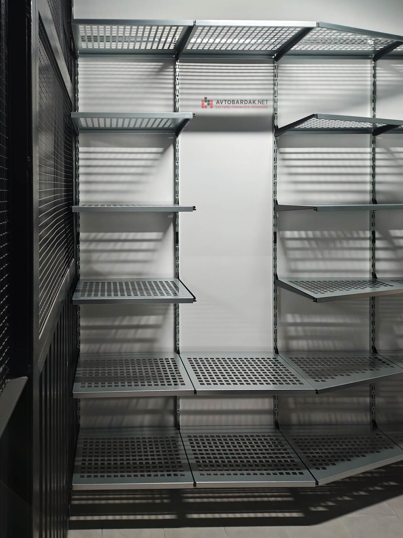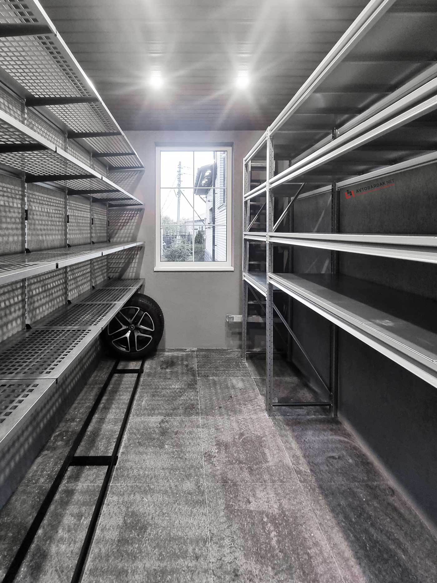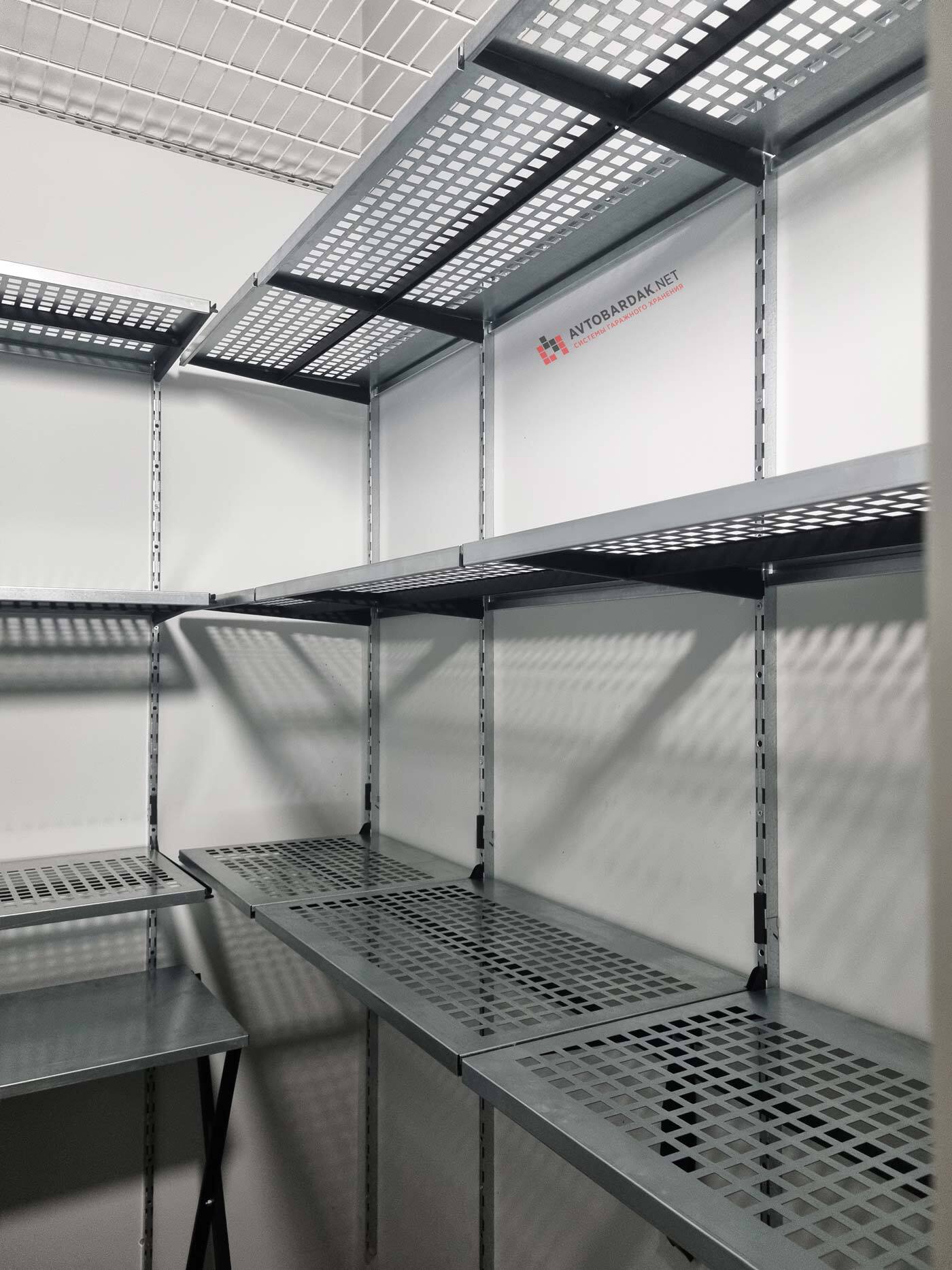 Кладовка со стальными полками черного цвета. На стенах закреплены прорезиненные блоки для хранения лыж. Установлены ряды металлических модульных полок. На одной из стены закреплены ряды рейлингов с крюками для подвеса шлемов, лыжных ботинок или коньков. Самокаты можно закрепить под полками на крюки.