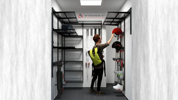 Кладовка со стальными полками черного цвета. На стенах закреплены прорезиненные блоки для хранения лыж. Установлены ряды металлических модульных полок. На одной из стены закреплены ряды рейлингов с крюками для подвеса шлемов, лыжных ботинок или коньков. Самокаты можно закрепить под полками на крюки.