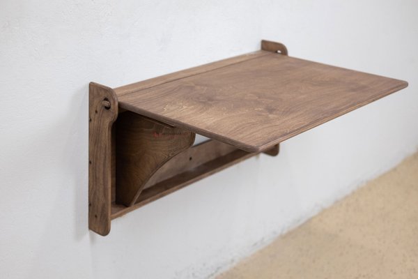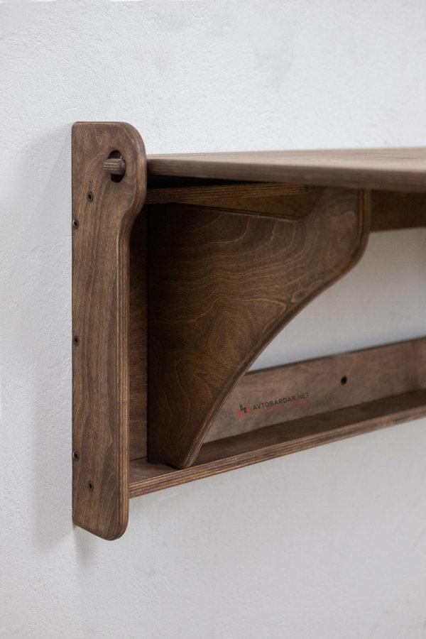 В нижней части складного стола расположены поворотные кронштейны со специальным "шипом". Сначала поднимаем столешницу, затем поворачиваем кронштейн перпендикулярно стене и заводим шип на кронштейне в паз с внутренней стороны столешницы.