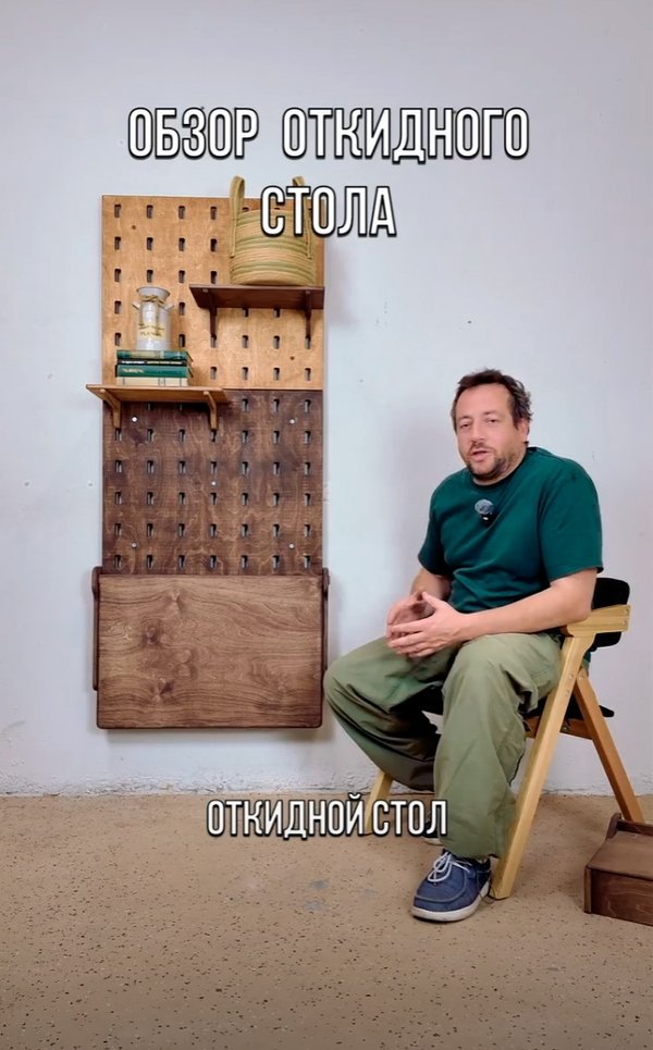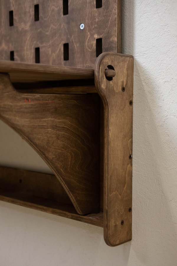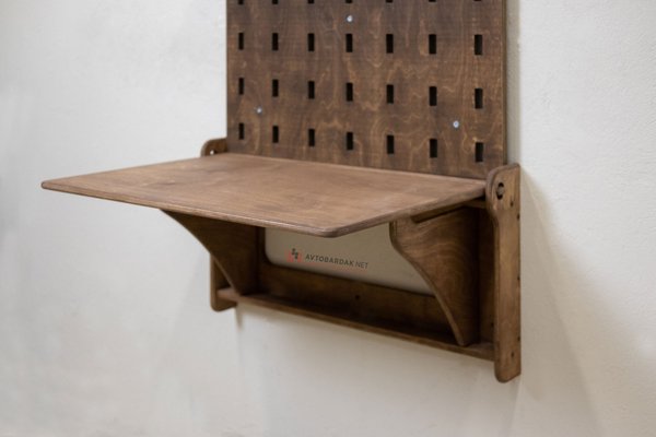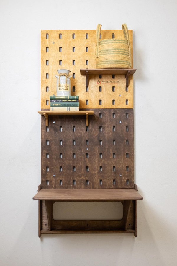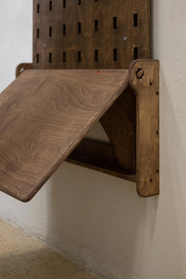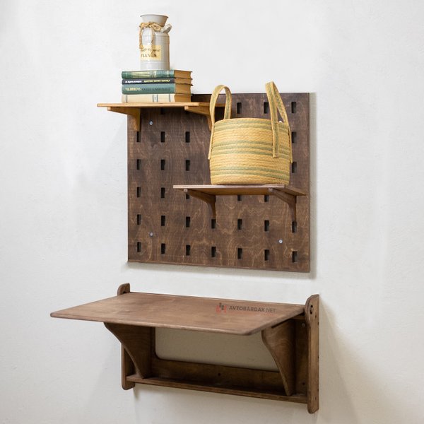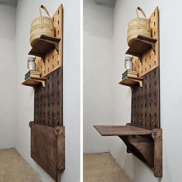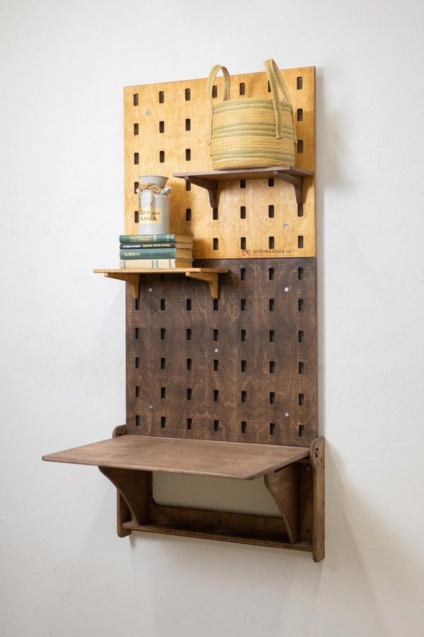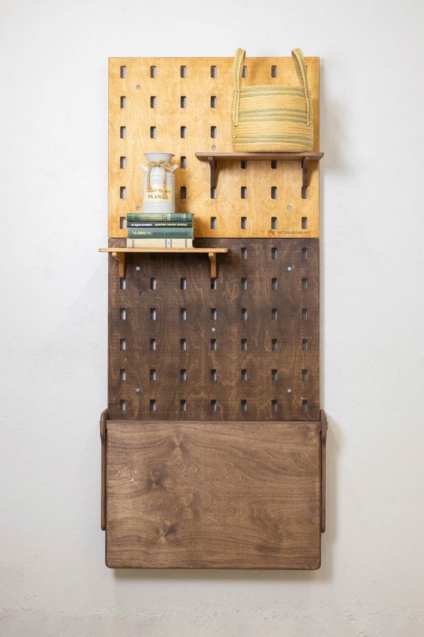 Обратите внимание на настенную систему хранения над складным столом. Это деревянная система Woody. К стене крепим пегдобрды (деревянные панели с перфорацией) или вертикальные направляющие, на которые можно навешивать полки, полочки, шкафы, выдвижные и простые ящики, множество компонентов деревянной гардеробной. Полный каталог и описание настенной системы Вуди - по ссылке.