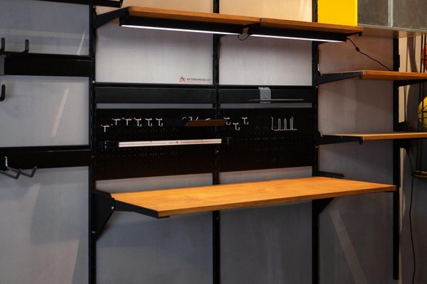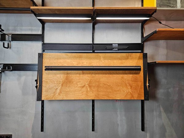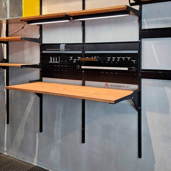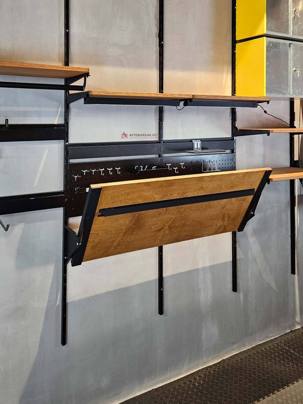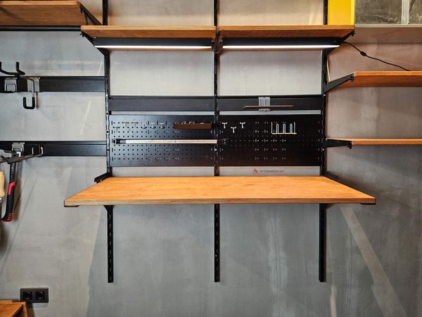 Столешница откидывается наверх, расстояние между стеной или перфорированными панелями, которые подвешиваются на вертикальные направляющие IF - 120 мм, так, чтобы в зазор поместился лоток IF и другие крючки и держатели инструментов.