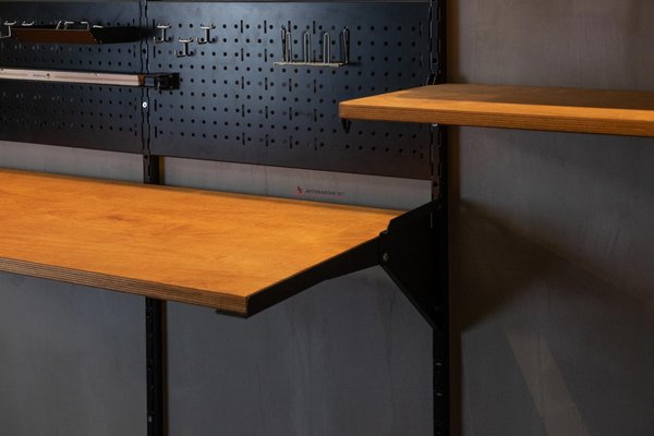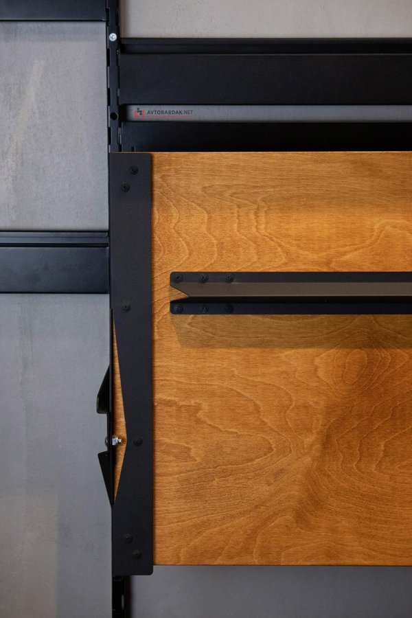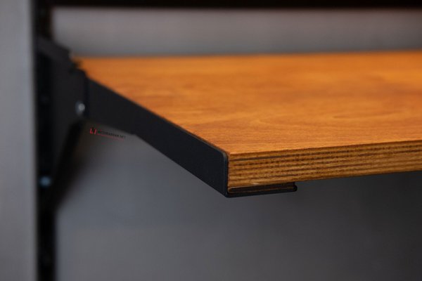 Подвешивается на вертикальные направляющие системы IF с помощью специальных кронштейнов – боковых держателей черного цвета. Описание системы IF по ссылке. Сама система преимущественное металлическая, но есть раздел с элементами из дерева (полки) в одном стиле с этим откидным столом – перейти по этой ссылке.