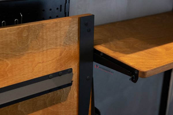 Откидной стол поставляется в разобранном виде: отдельно столешница, кронштейны, боковые держатели, ребра жесткости. Крепеж (болты для соединения кронштейнов и боковых держателей и мебельные саморезы для крепления столешницы к боковинам) идет в комплекте.
