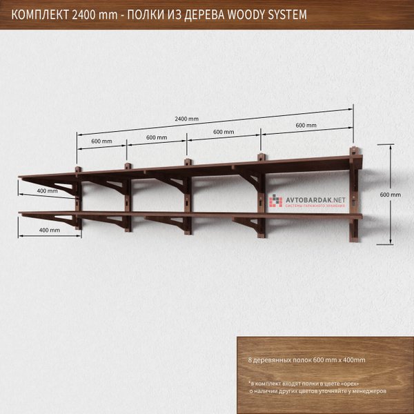 Стеллаж из дерева. Цвет Орех. Длина 2400 мм. Глубина полок 400 мм. (набор №59)