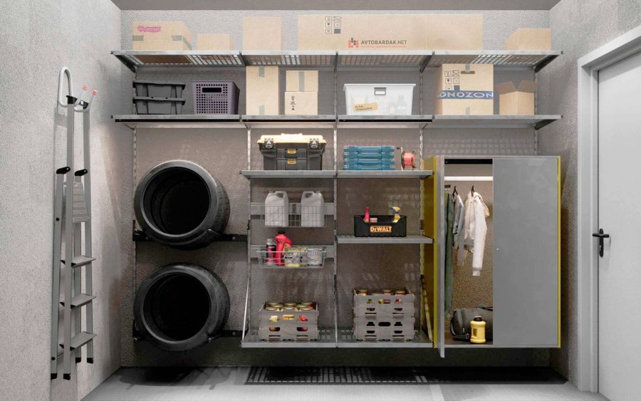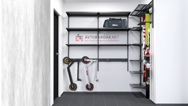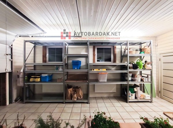 Напольный стеллаж глубиной 600 оптимально занимает все пространство между стеной гаража и рейлингами гаражных ворот, не препятствуя открытию/закрытию.