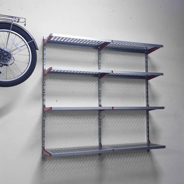 Система модульная, металлические полки можно перевешивать, стеллаж можно добавлять новыми элементами: перфопанелями для инструментов, откидными столами. Так же стеллаж можно пролить по горизонтали и по вертикали, докупить новые элементы.
