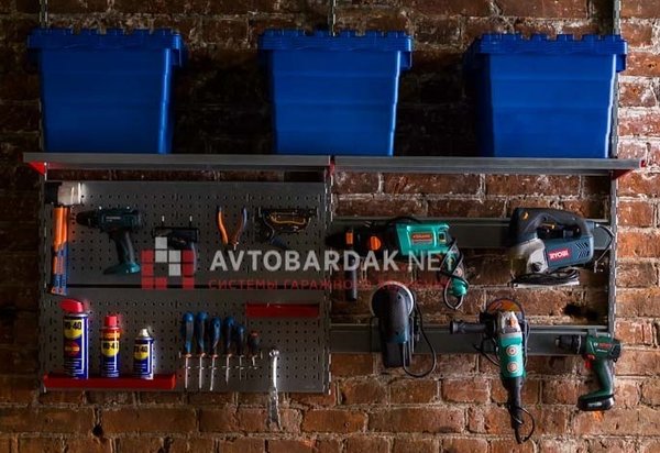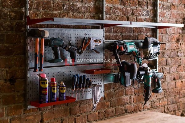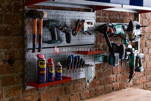 Для хранения инструментов и метизов на перфорированной панели вам понадобятся лотки и крючки.